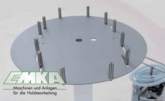 Der obere Teil enthält eine Drehscheibe, die als Träger für verklebende Stücke und Bauteile dient. Die auf der Scheibe befestigten Stifte gleiten (in bestimmten Schlitzen) und sind verstellbar, um die zu verklebenden Teile jenach ihrer Größe zu positionieren und aufzuhalten.